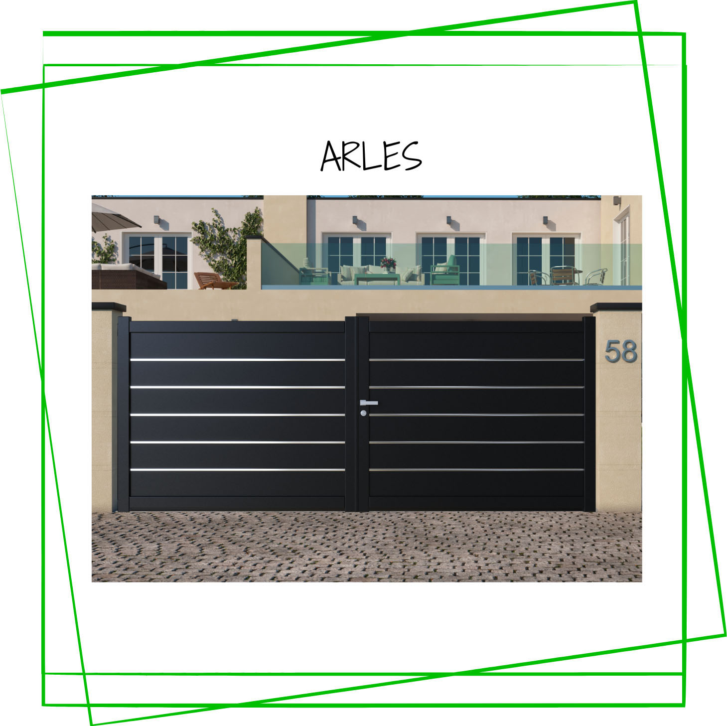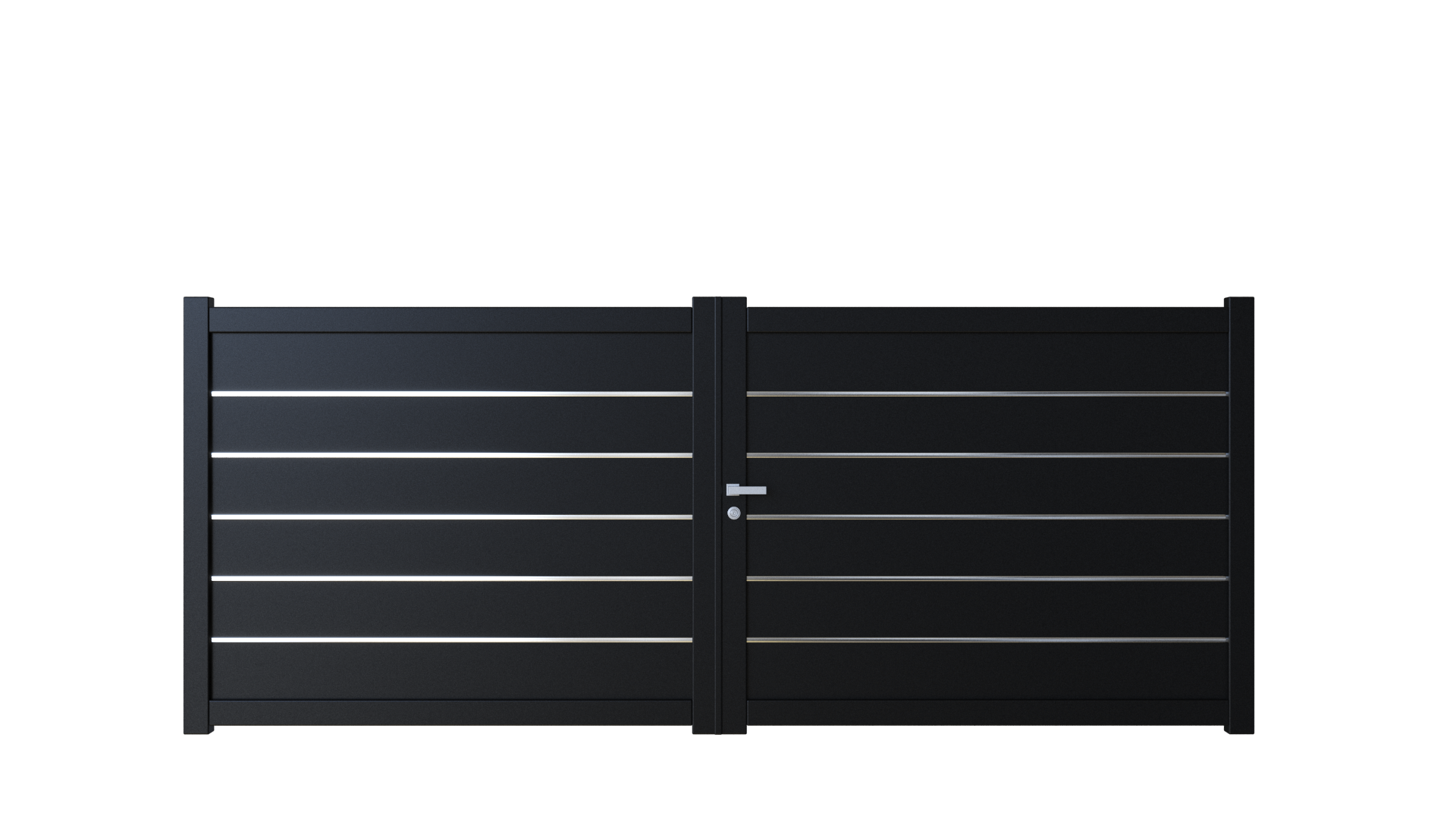 Descubra a gama DÉCOLINE, composta por portões de batente em alumínio com acabamento elegante em alumínio escovado, que traz estilo moderno e sofisticado à sua entrada.