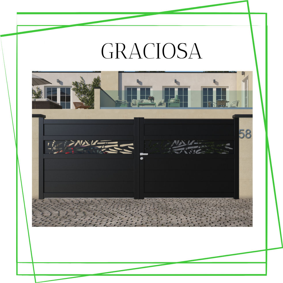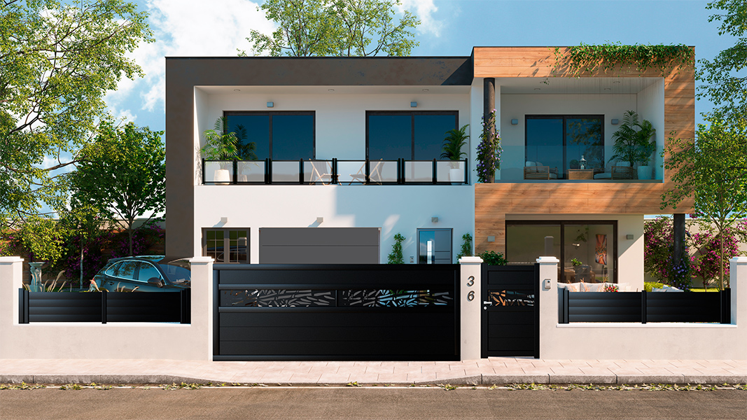 Descubra a exclusividade da gama TERRANÉO, composta por portões de batente em alumínio únicos com padrões finamente recortados a laser, que trazem elegância e originalidade à sua entrada.