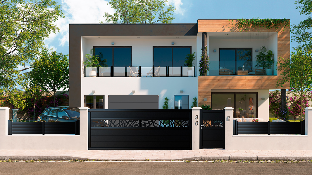 Descubra a exclusividade da gama TERRANÉO, composta por portões de batente em alumínio únicos com padrões finamente recortados a laser, que trazem elegância e originalidade à sua entrada.